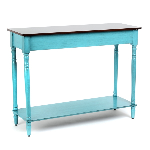 Uncategorized Turquoise Blue Console Table - Shop blue console tables at luxedecor.com. A distressed turquoise console, corals and pebbles, a potted flowers and some vintage posters.